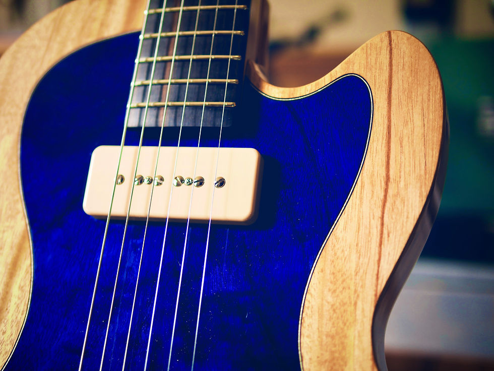Tasmanian tiger myrtle in Australian Blackwood body. Lollar Novel Foil pickups in custom red/black. Aluminium neck by The Electrical Guitar Company.